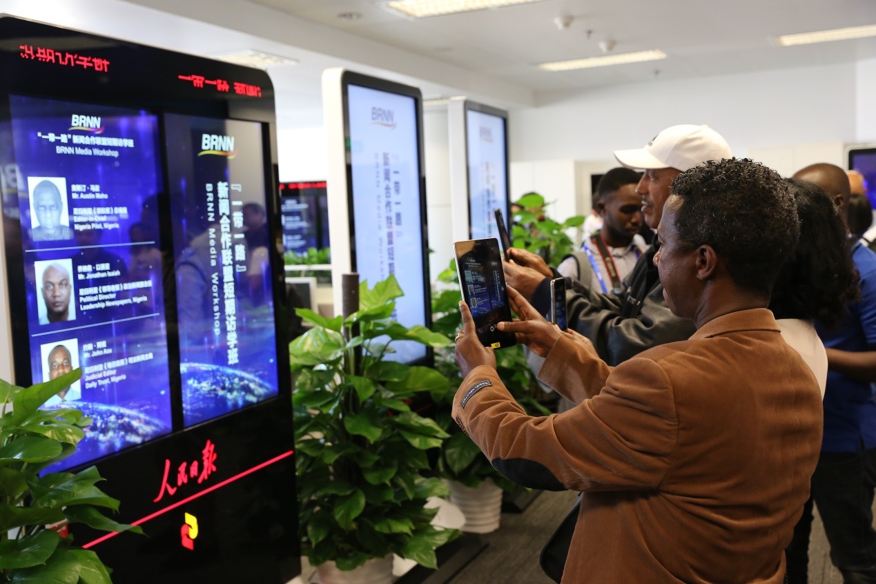 A visiting journalist takes picture of a screen displaying China’s new media technology.(Photo: People's Daily/Chu Jiawei) A short-term media workshop under the Belt and Road News Network (BRNN) kicked off in Beijing on Sept.…