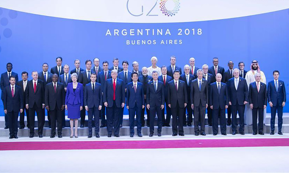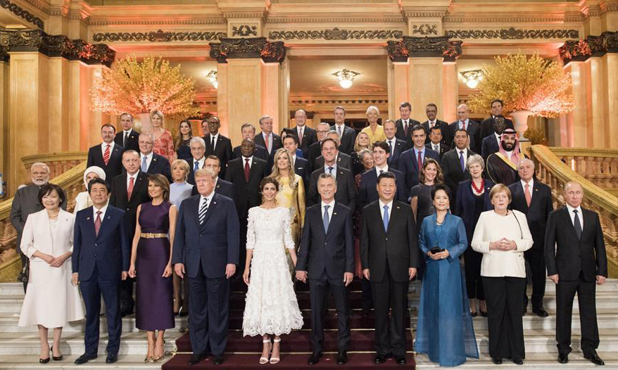 Chinese President Xi Jinping (4th R, front row) and his wife Peng Liyuan (3rd R, front row) pose for group photos with foreign leaders and their spouses in Buenos Aires, Argentina, Nov. 30, 2018.…