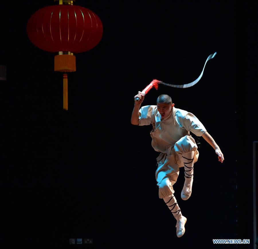 A Kungfu master from central China's Henan Province performs martial arts during a reception to mark the 70th anniversary of the founding of the People's Republic of China in Bandar Seri Begawan, Brunei, Sept. 24, 2019.