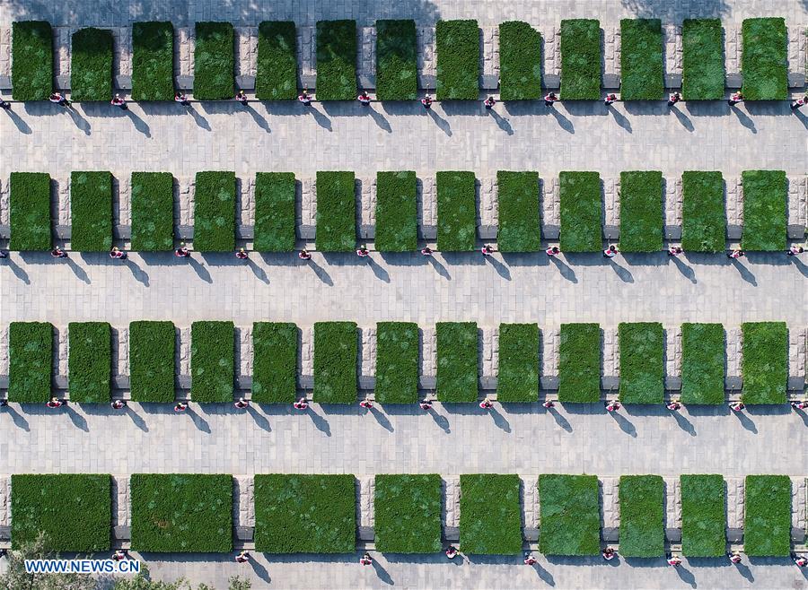 Aerial photo taken on Sept. 29, 2019 shows pupils laying flowers at a revolutionary martyrs' cemetery in Handan, north China's Hebei Province.