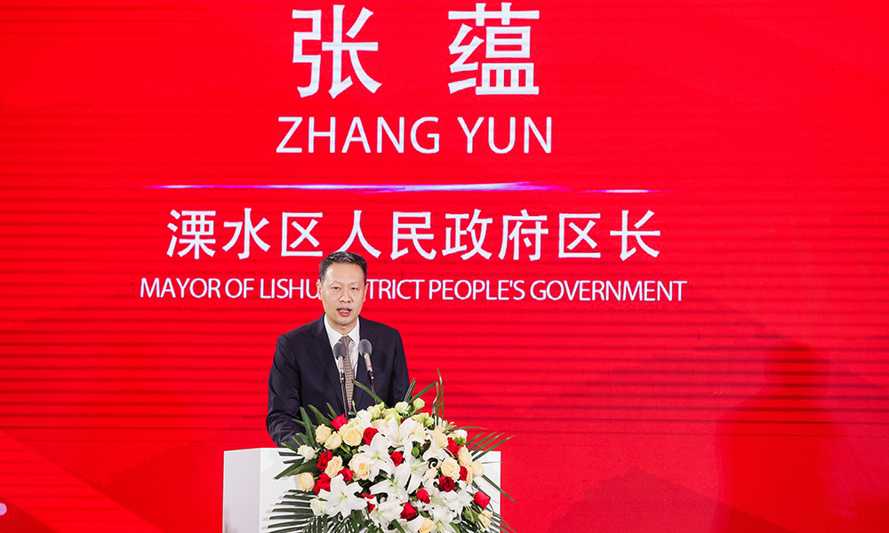 Xue Fengguan, secretary of the Communist Party of China Lishui district committee, gives a speech at the conference.