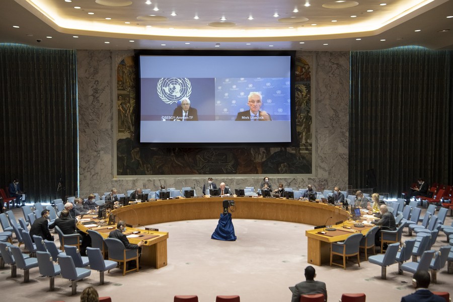 Photo taken on Oct. 15, 2020 shows a view of the United Nations Security Council meeting on the situation in Yemen at the UN headquarters in New York.…