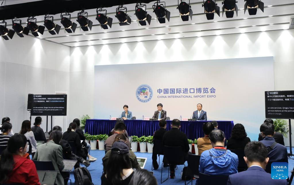 This photo taken on Nov. 10, 2022 shows a news briefing for the closing of the fifth China International Import Expo (CIIE) at the National Exhibition and Convention Center (Shanghai) in east China's Shanghai.…