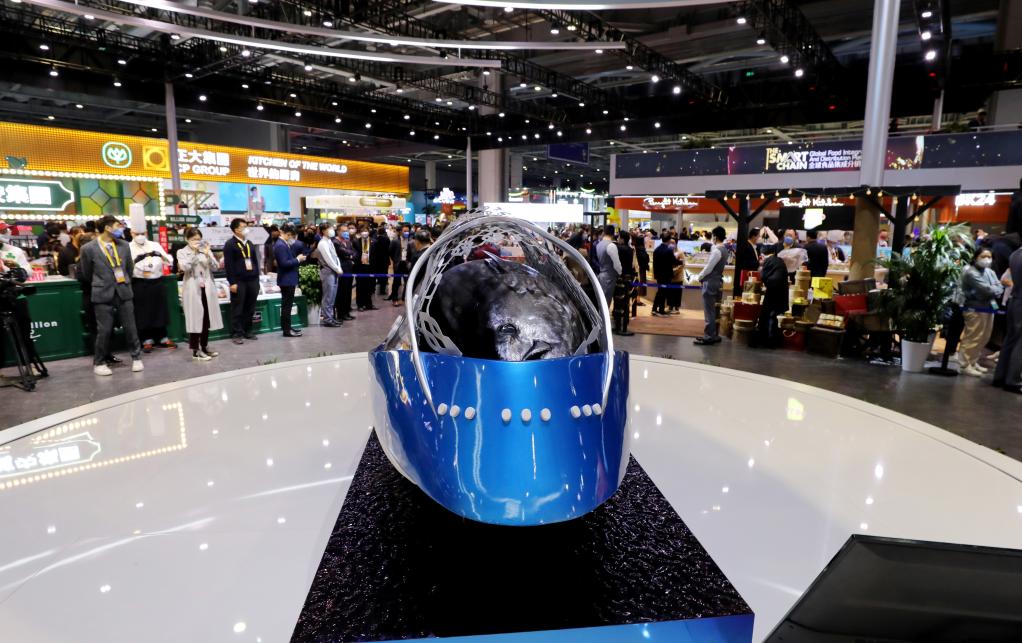 A 370-kilogram bluefin tuna is on display at the food and agricultural products exhibition area of the fifth China International Import Expo (CIIE) at the National Exhibition and Convention Center (Shanghai) in east China's Shanghai, Nov. 6, 2022.…
