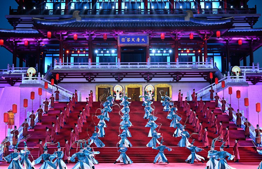 Artists perform during a welcome ceremony for Central Asian leaders and their wives attending the China-Central Asia Summit in the Tang Paradise in Xi'an, northwest China's Shaanxi Province, May 18, 2023. (Xinhua/Shen Hong)