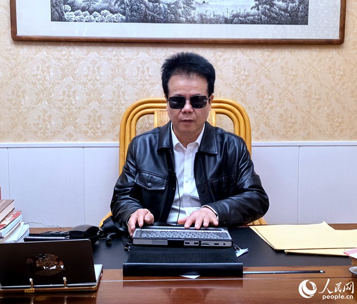 Wang Yongcheng, a deputy to the 14th National People's Congress, uses a computer for persons with visual impairments. (People's Daily Online/Lin Xiaoli)