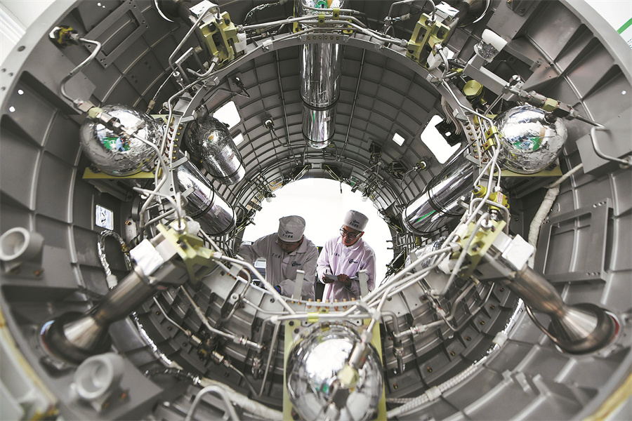 Technicians test a high-tech power system used in space applications at a scientific company in Beijing on Feb 28. [Photo/Xinhua]