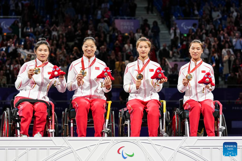 Gold medalists team China pose during the awarding ceremony for the Wheelchair Fencing women's foil team event at the Paris 2024 Paralympic Games in Paris, France, Sept. 5, 2024.…