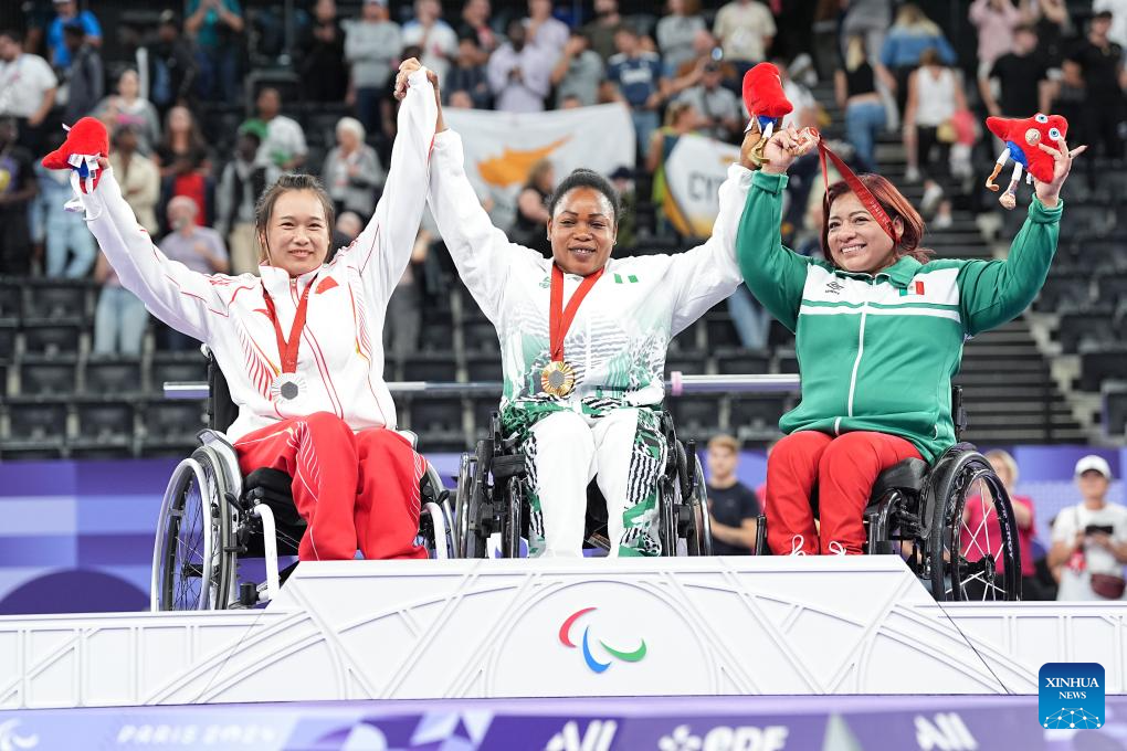 Gold medalist Onyinyechi Mark (C) of Nigeria, silver medalist Cui Jianjin (L) of China and bronze medalist Amalia Perez Vazquez of Mexico pose during the awarding ceremony for the para powerlifting women's up to 61kg event at the Paris 2024 Paralympic Games in Paris, France, Sept. 6, 2024.…