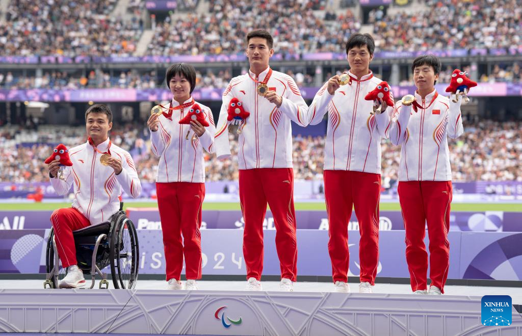 Gold medalists Hu Yang, Wen Xiaoyan, Wang Hao, Jia Dengpu and Zhou Guohua (L-R) of team China pose with medals during the awarding ceremony for the 4x100m Universal Relay final of Para Athletics at the Paris 2024 Paralympic Games in Paris, France, Sept. 7, 2024.
