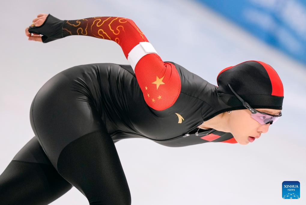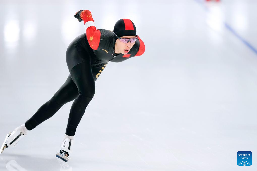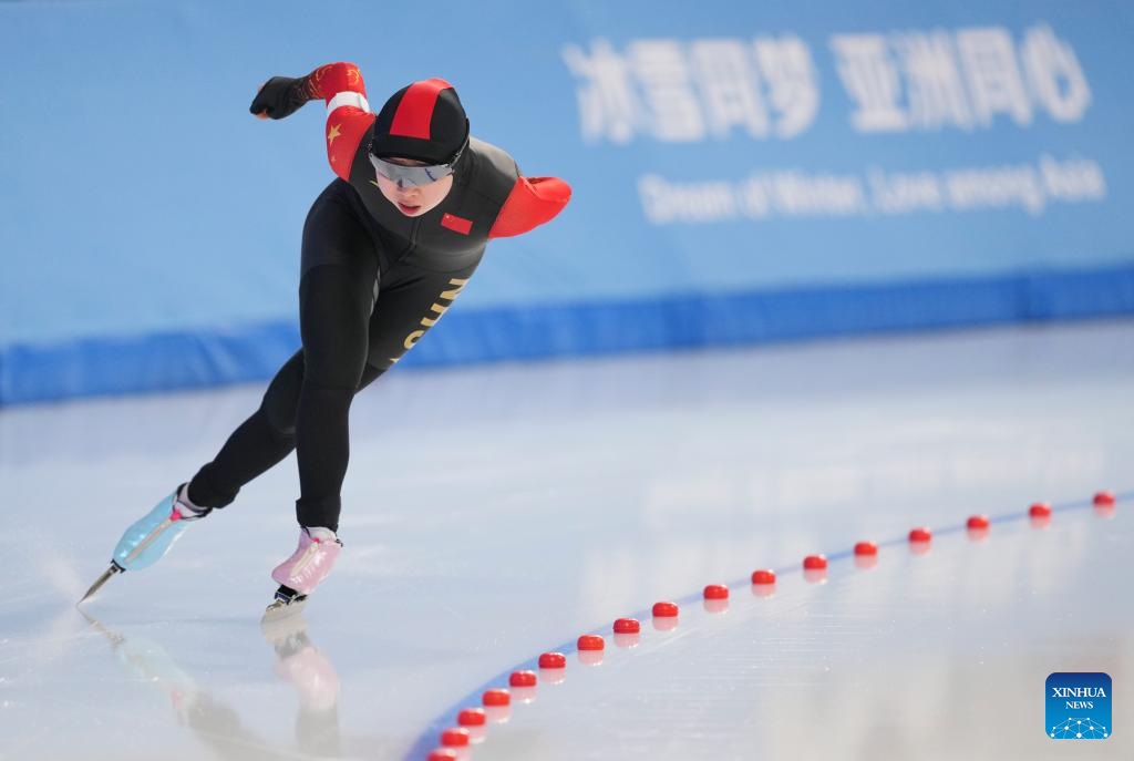 Tai Zhien of China competes during the women's 3000m final match of the speed skating event at the 9th Asian Winter Games in Harbin, northeast China's Heilongjiang Province, Feb. 10, 2025. (Xinhua/Li Yibo)