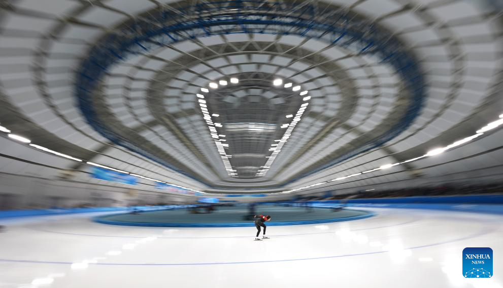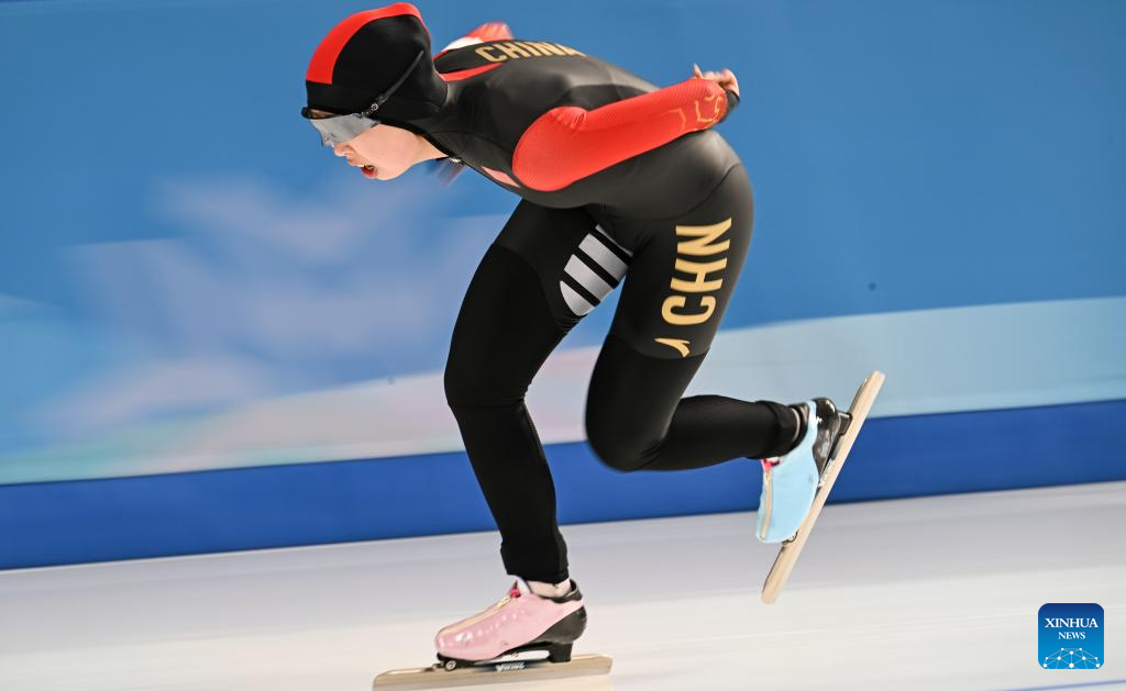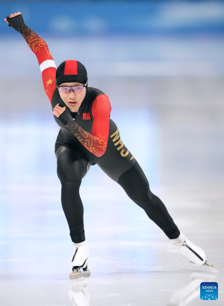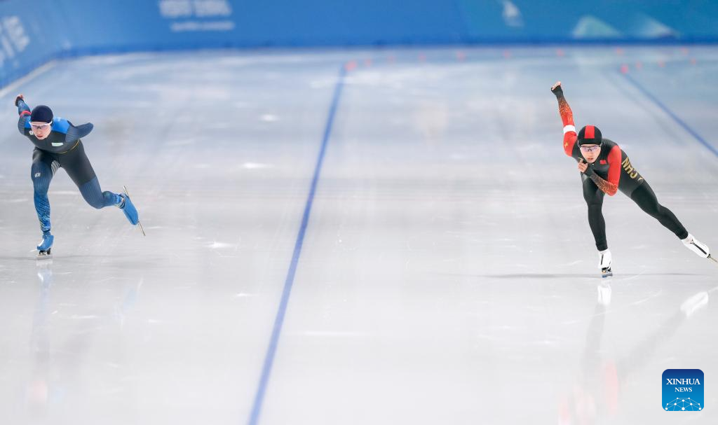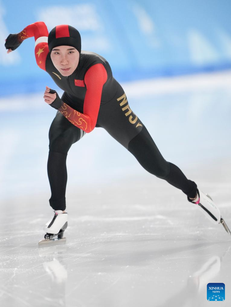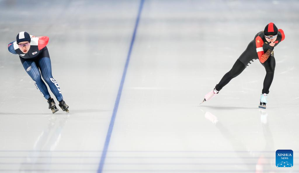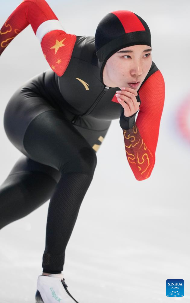 Han Mei of China competes during the women's 3000m final match of the speed skating event at the 9th Asian Winter Games in Harbin, northeast China's Heilongjiang Province, Feb. 10, 2025. (Xinhua/Li Yibo)