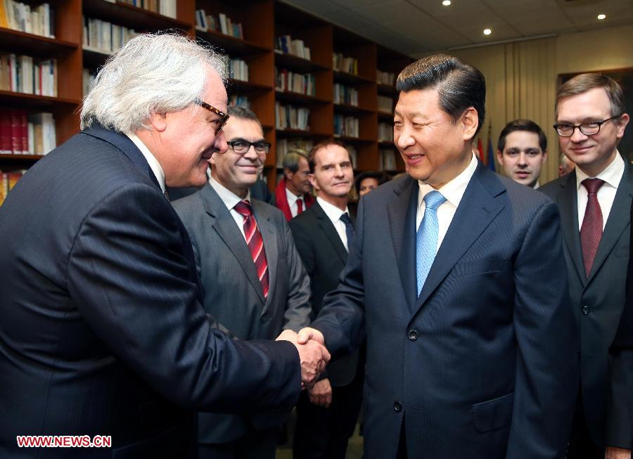 Chinese President Xi Jinping (front R), meets with French friends during his visit to the Charles de Gaulle Foundation in Paris, capital of France, March 26, 2014. (Xinhua/Yao Dawei)