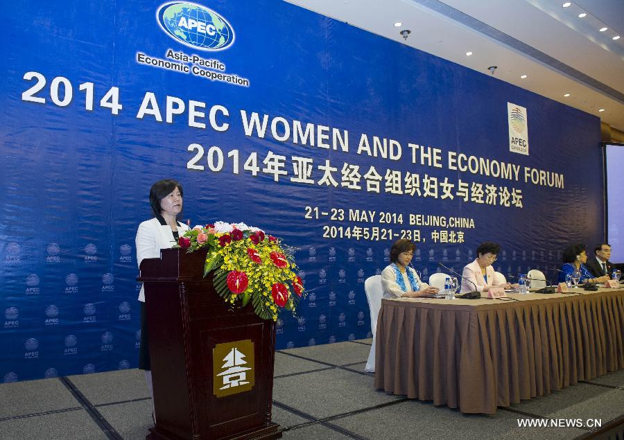 Shen Yueyue, vice chairwoman of the Standing Committee of the National People's Congress of China and chairwoman of the All-China Women's Federation (ACWF), gives a speech at the opening ceremony of the 2014 APEC Women and The Economy Forum in Beijing, capital of China, May 22, 2014. (Xinhua/Wang Ye)