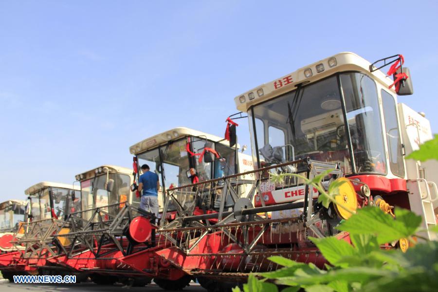 About 100 reapers prepare to set out to take part in harvesting wheat in Huangxian County of Anyang City, central China's Henan Province, May 23, 2014. China's wheat production areas have entered into a wheat harvest season. (Xinhua/Liu Xiaokun)
