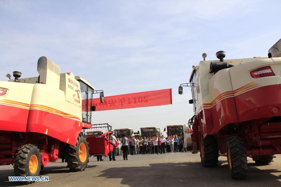 About 100 reapers prepare to set out to take part in harvesting wheat in Huangxian County of Anyang City, central China's Henan Province, May 23, 2014. China's wheat production areas have entered into a wheat harvest season. (Xinhua/Liu Xiaokun)