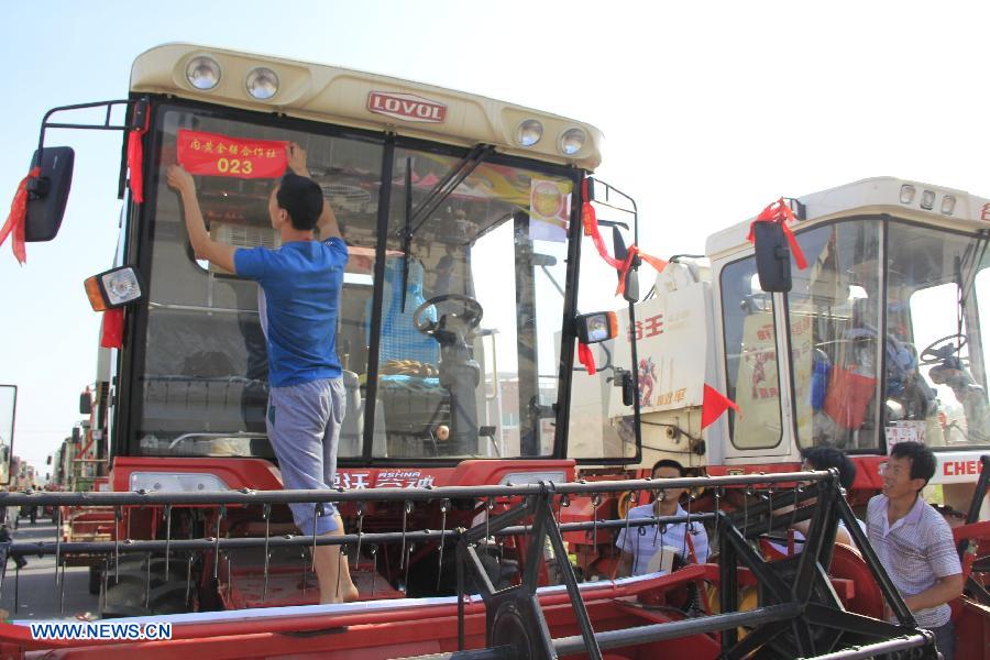 About 100 reapers prepare to set out to take part in harvesting wheat in Huangxian County of Anyang City, central China's Henan Province, May 23, 2014. China's wheat production areas have entered into a wheat harvest season. (Xinhua/Liu Xiaokun)