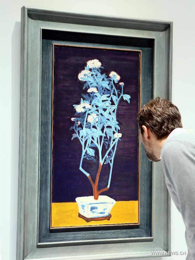 A visitor views a displayed painting, estimated to fetch between 18 million to 2200 million Hong Kong dollars(2.32 million to 2.83 million U.S. dollars), during the preview of Christie's Hong Kong 2014 spring season in Hong Kong, south China, May 23, 2014. The auction will be held from May 24 to 28. (Xinhua/Li Peng)