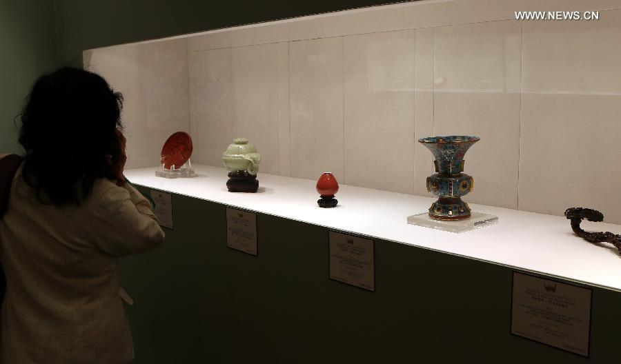 A visitor views the displayed artworks during the preview of Christie's Hong Kong 2014 spring season in Hong Kong, south China, May 23, 2014. The auction will be held from May 24 to 28. (Xinhua/Li Peng)
