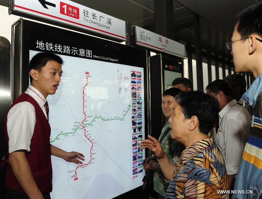 People consult a staff member on subway Line 1 in Wuxi City, east China's Jiangsu Province, May 25, 2014. The subway Line 1 of Wuxi started trial operation on Sunday. With the line's official opening to traffic in late June, Wuxi will become the third city in Jiangsu to have subway. (Xinhua/Huan Yueliang) |