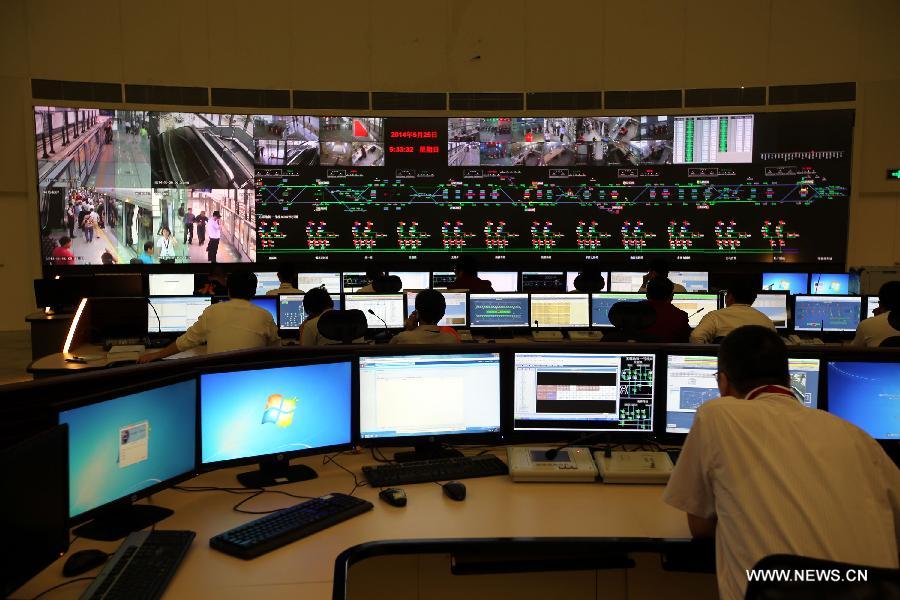 Workers monitor passenger flow of every station at the subway control center in Wuxi City, east China's Jiangsu Province, May 25, 2014. The subway Line 1 of Wuxi started trial operation on Sunday. With the line's official opening to traffic in late June, Wuxi will become the third city in Jiangsu to have subway. (Xinhua/Huan Yueliang)