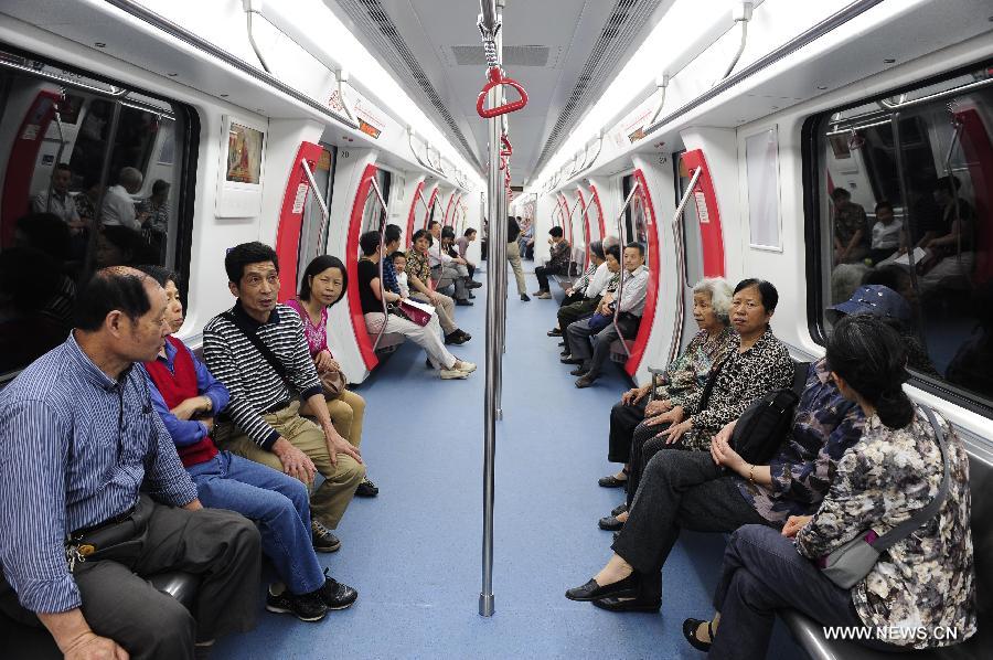 People take subway Line 1 in Wuxi City, east China's Jiangsu Province, May 25, 2014. The subway Line 1 of Wuxi started trial operation on Sunday. With the line's official opening to traffic in late June, Wuxi will become the third city in Jiangsu to have subway. (Xinhua/Huan Yueliang) |