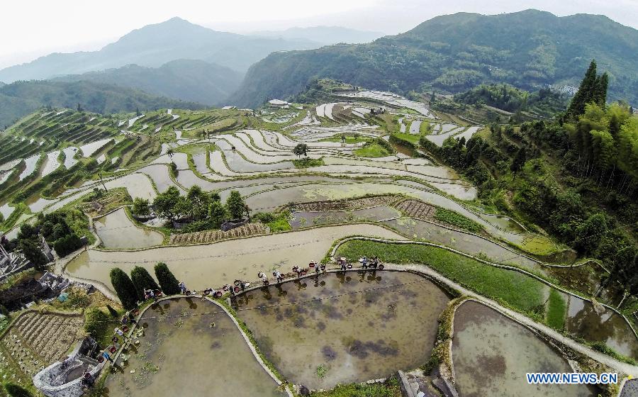 Farmers prepare to put fish in the terraced fields in Xiaozhoushan Township of Qingtian County, east China's Zhejiang Province, May 29, 2014. Local farmers have the long tradition of raising fish in the rice fields. (Xinhua/Xu Yu)