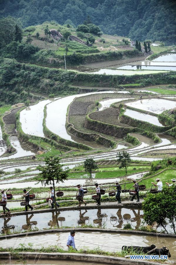 Farmers prepare to put fish in the terraced fields in Xiaozhoushan Township of Qingtian County, east China's Zhejiang Province, May 29, 2014. Local farmers have the long tradition of raising fish in the rice fields. (Xinhua/Xu Yu)