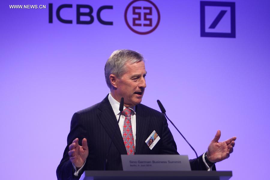 Co-chairman of the board of directors of Deutsche Bank Juergen Fitschen speaks during the 2014 Sino German Business Summit in Berlin, Germany, on June 4, 2014. (Xinhua/Zhang Fan)