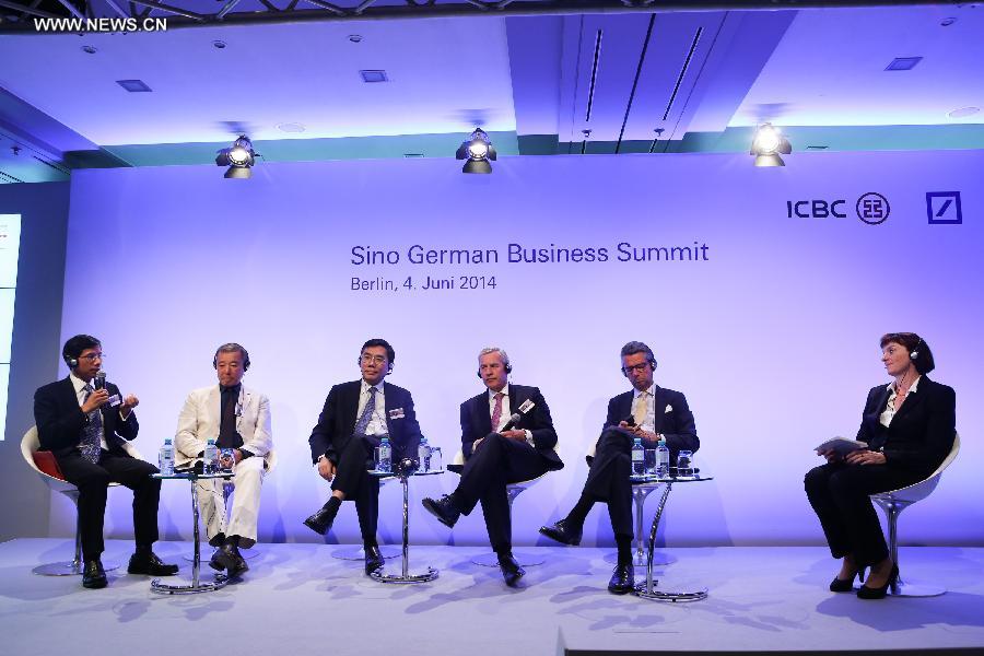 Chairman of the Industrial and Commercial Bank of China (ICBC) Jiang Jianqing (3rd L) and Co-chairman of the board of directors of Deutsche Bank Juergen Fitschen (3rd R) attend a discussion forum of the 2014 Sino German Business Summit in Berlin, Germany, on June 4, 2014. (Xinhua/Zhang Fan) |