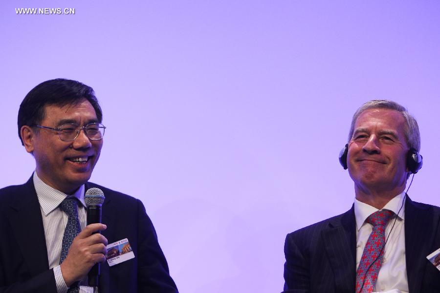 Chairman of the Industrial and Commercial Bank of China (ICBC) Jiang Jianqing (L) and Co-chairman of the board of directors of Deutsche Bank Juergen Fitschen attend a discussion forum of the 2014 Sino German Business Summit in Berlin, Germany, on June 4, 2014. (Xinhua/Zhang Fan) |