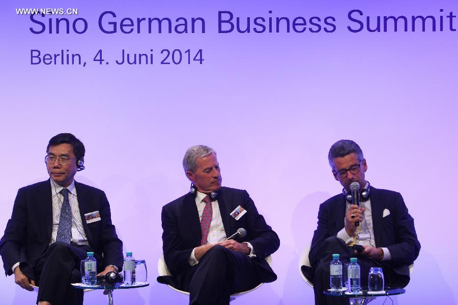 Chairman of the Industrial and Commercial Bank of China (ICBC) Jiang Jianqing (L) and Co-chairman of the board of directors of Deutsche Bank Juergen Fitschen (C) attend a discussion forum of the 2014 Sino German Business Summit in Berlin, Germany, on June 4, 2014. (Xinhua/Zhang Fan) |