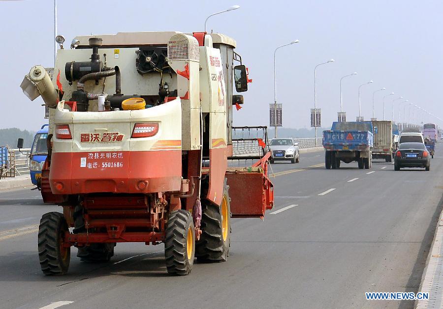 A combine harvester makes its way on a bridge across the Yellow River in Zhengzhou, capital of central China's Henan Province, June 3, 2014. Harvest work is in progress amid wheat fields in Henan, a major producing area of the crop. (Xinhua/Wang Song) |