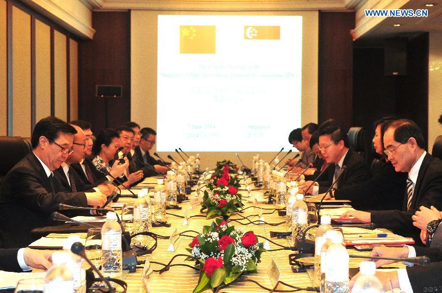 China's Minister of Commerce Gao Hucheng (1st L) and Singapore's Trade and Industry Minister Lim Hng Kiang (1st R) attend the fourth meeting of the Singapore-China Investment Promotion Committee (IPC) held at Singapore's Marina Mandarin, June 5, 2014. (Xinhua/Then Chih Wey) |