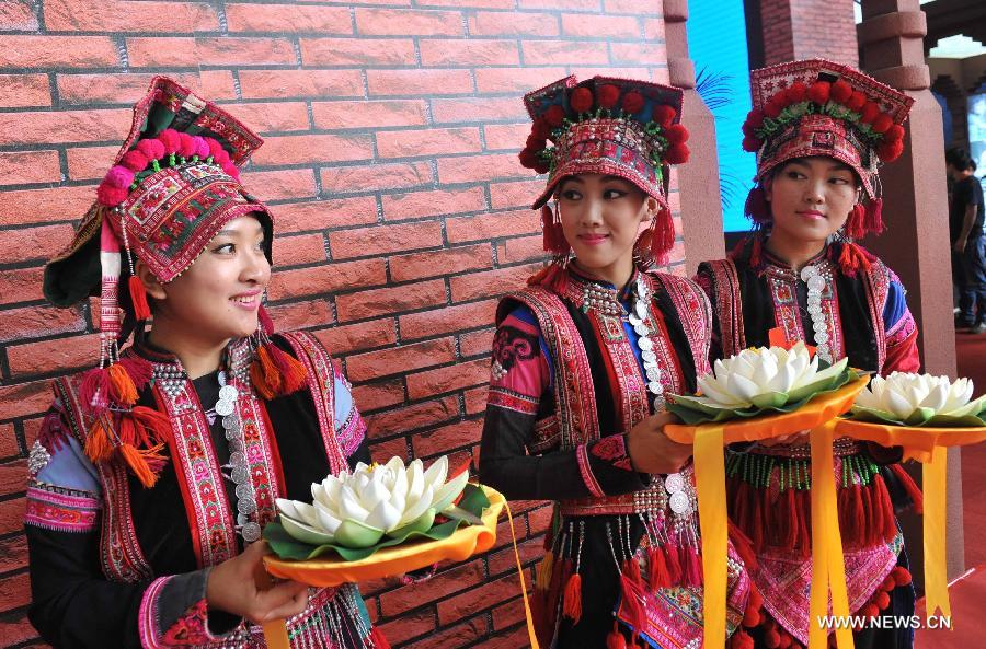 Girls from an ethnic group are seen in the opening ceremony of the 2nd China-South Asia Expo in Kunming, capital of southwest China's Yunnan Province, June 6, 2014. Over 1,000 enterprises from 46 countries and regions took part in the expo which will last till June 10. (Xinhua/Lin Yiguang) |