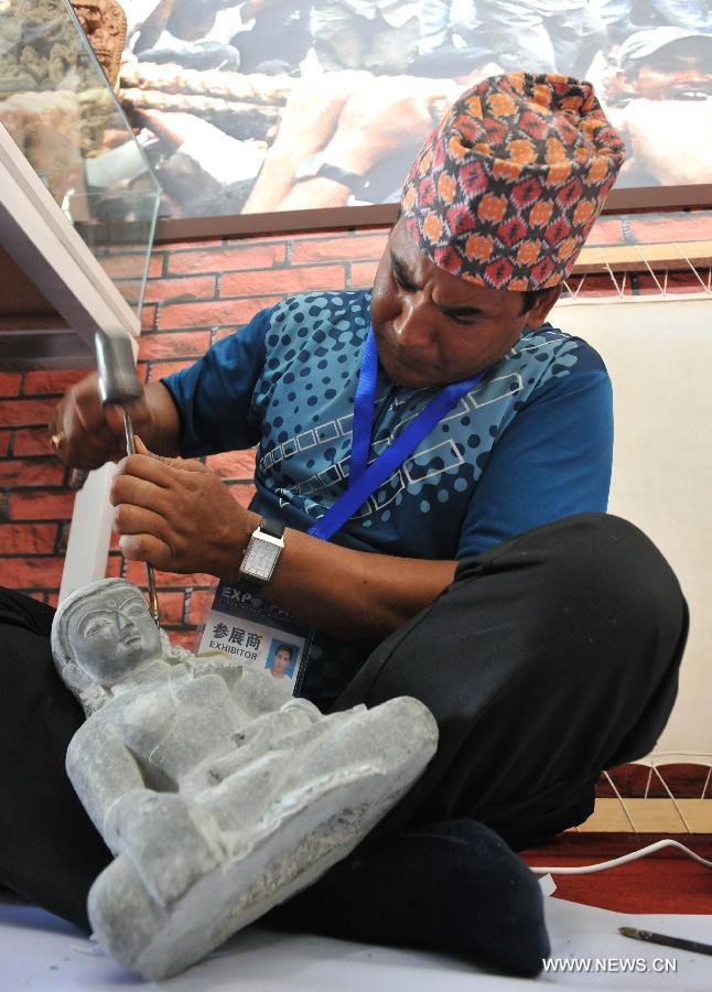 An exhibitor from Nepal makes a sculpture in the 2nd China-South Asia Expo in Kunming, capital of southwest China's Yunnan Province, June 6, 2014. Over 1,000 enterprises from 46 countries and regions took part in the expo which will last till June 10. (Xinhua/Lin Yiguang) |