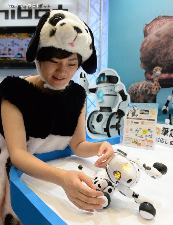 A staff member displays a dog robot during the International Tokyo Toy Show in Tokyo, capital of Japan, June 12, 2014. The International Tokyo Toy Show opened here on Thursday. Some 157 attendees from Japan and other countries and regions displayed about 35,000 new toys during the show. (Xinhua/Ma Ping) |