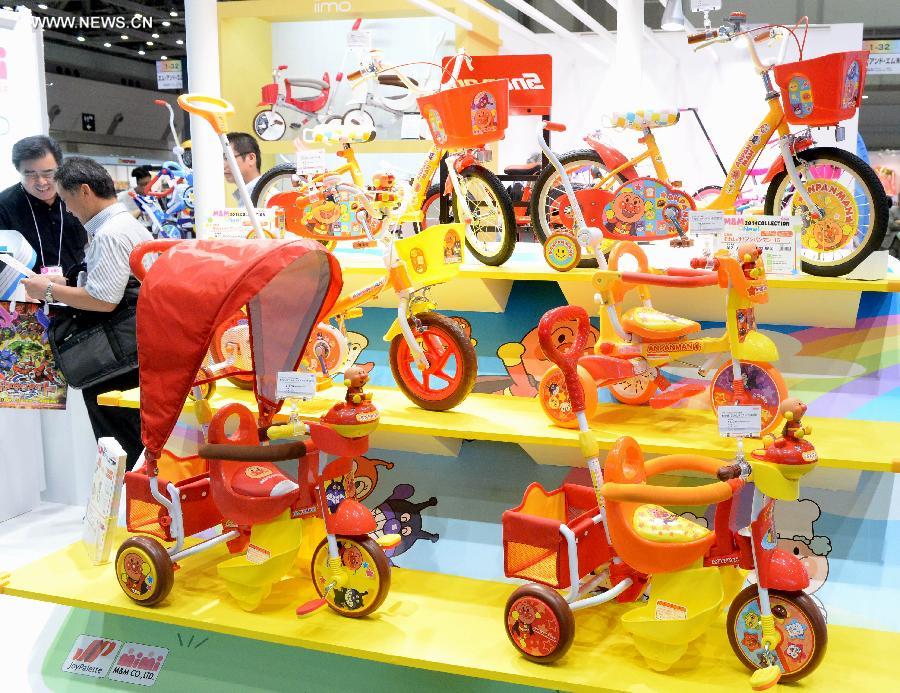 Some toy bicycles and toy tricycles are displayed during the International Tokyo Toy Show in Tokyo, capital of Japan, June 12, 2014. The International Tokyo Toy Show opened here on Thursday. Some 157 attendees from Japan and other countries and regions displayed about 35,000 new toys during the show. (Xinhua/Ma Ping) |