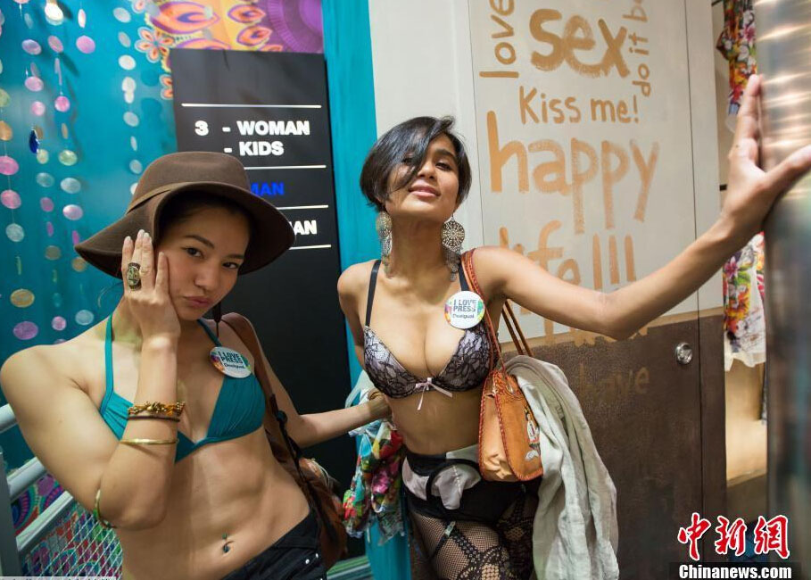 The picture published on Tuesday June 24, 2014, shows that shoppers wearing colorful swimwear in Tokyo, Japan, pose for a picture at a local store, which has promised that the first 100 consumers who shopped there bedecked in swimwear would be given certain products, free of charge, as part of a promotion. [Photo: Chinanews.com] |