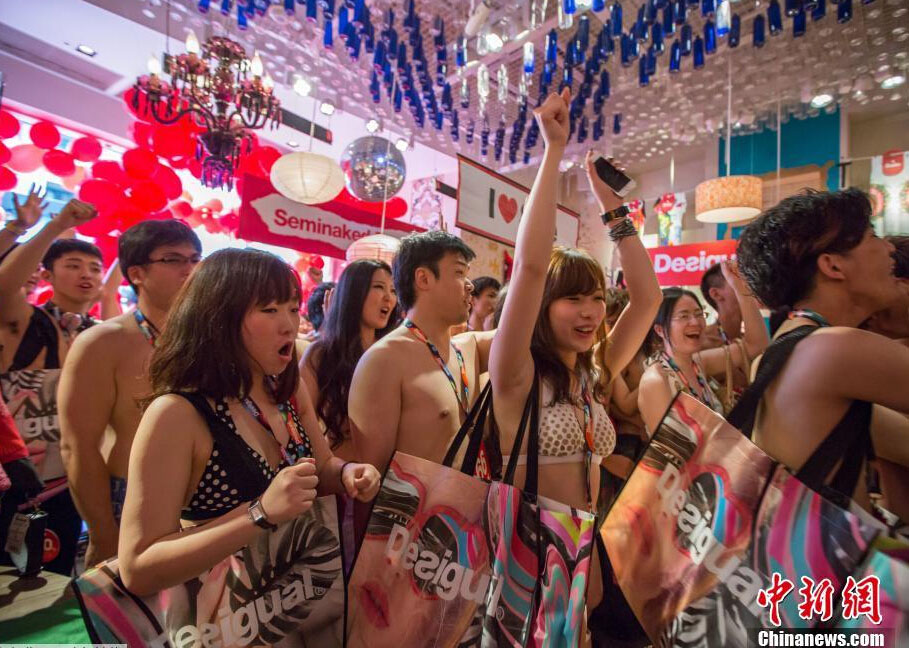 The picture published on Tuesday June 24, 2014, shows that shoppers wearing colorful swimwear in Tokyo, Japan, pose for a picture at a local store, which has promised that the first 100 consumers who shopped there bedecked in swimwear would be given certain products, free of charge, as part of a promotion. [Photo: Chinanews.com] |