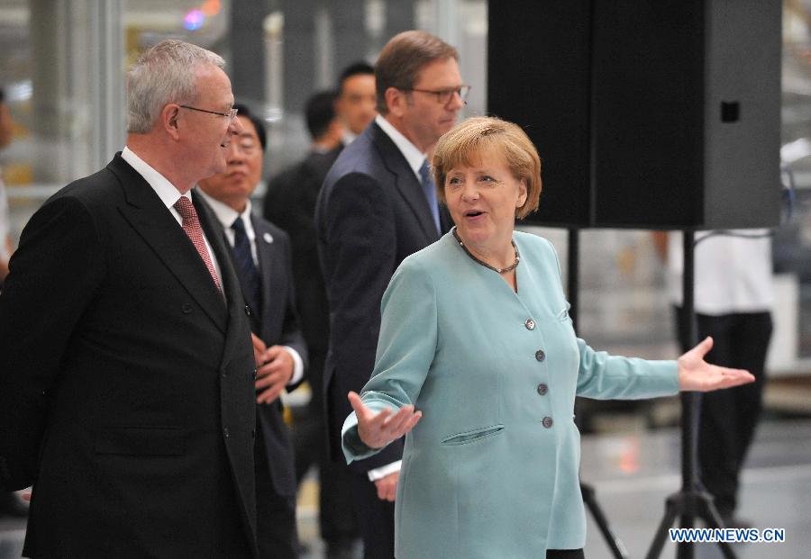 German Chancellor Angela Merkel (R) visits the branch company of FAW-Volkswagen in Chengdu, capital of southwest China's Sichuan Province, July 6, 2014. Merkel is on her seventh China visit as chancellor from July 6 to 8. (Xinhua/Xue Yubin)