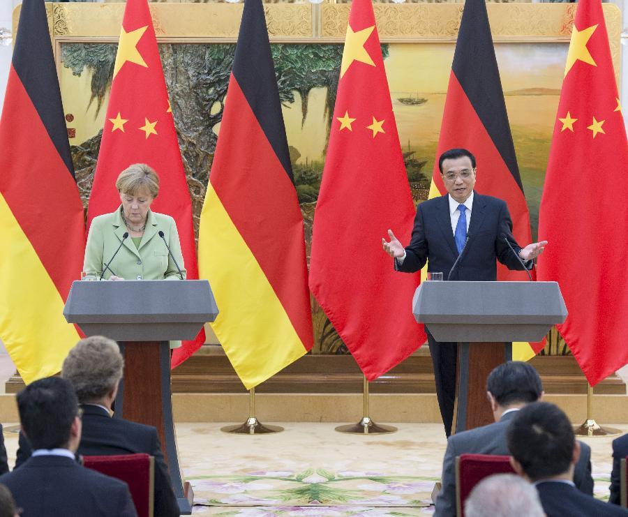 Chinese Premier Li Keqiang (R) and German Chancellor Angela Merkel meet the press after their talks in Beijing, capital of China, July 7, 2014. (Xinhua/Wang Ye) |