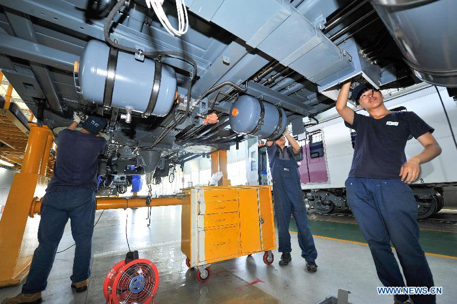 Workers assemble an EMU train to be sold to Brazil in a factory of CNR Changchun Railway Vehicles, a train manufacturer, in Changchun, capital of northeast China's Jilin Province, July 9, 2014. The Chinese company is making EMU trains for customers in Brazil and Argentina under purchase orders amounting to 100 and 150 trains respectively. It is also the manufacturer of train units which will serve the 2016 Summer Olympic Games in Rio de Jeneiro. (Xinhua/Xu Chang)