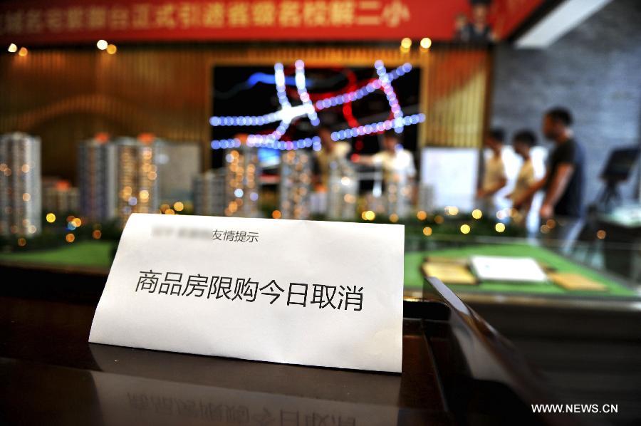 A notice shows the ending of home purchase restrictions at a sales office of new buildings in Jinan, capital of east China's Shandong Province, July 10, 2014. Jinan on Thursday lifted its three-year home purchase restrictions by allowing residents to buy more properties. (Xinhua/Xu Suhui) |