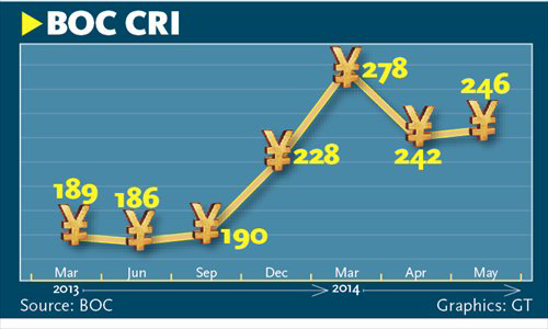 The CRI in May reached 246, up 4 points compared to a month earlier, and 18 points over December 2013, BOC said in a report on Saturday.