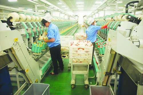 In the workshop of Xinjiang Ruisheng Textile Co, located in the city's economic and technological development zone, cotton packaged into stacks were piled up neatly, and on the other side, textile machines were spiraling fast.