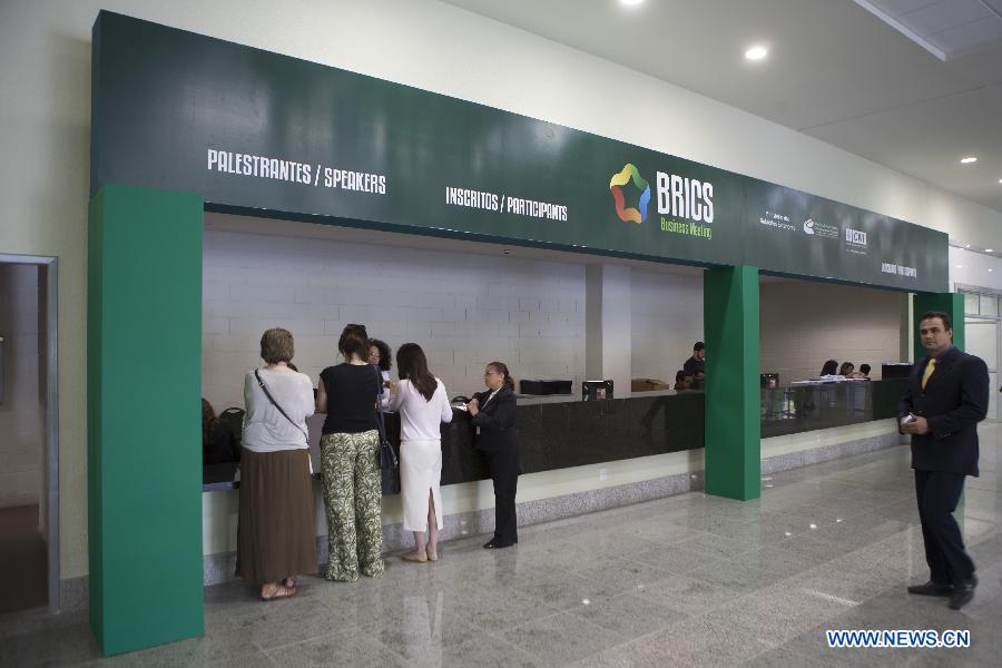 Reporters are seen at the information desk in the Center for Events of Estado Ceara in Fortaleza, Brazil, July 13, 2014. The sixth BRICS Summit will be held here on July 15, 2014. (Xinhua/Xu Zijian)