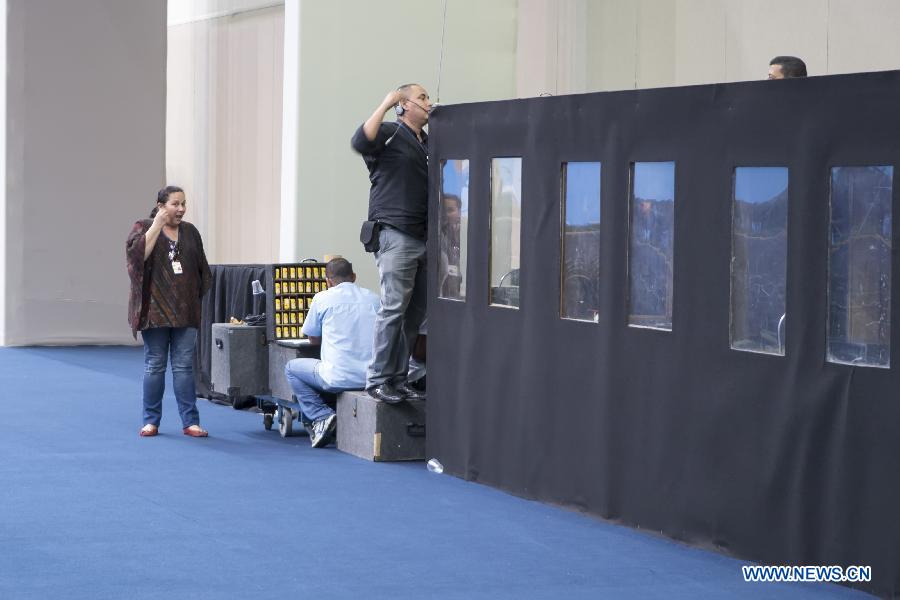 Staff members install the booth for interpreters at the Center for Events of Estado Ceara in Fortaleza, Brazil, July 13, 2014. The sixth BRICS Summit will be held here on July 15, 2014. (Xinhua/Xu Zijian)