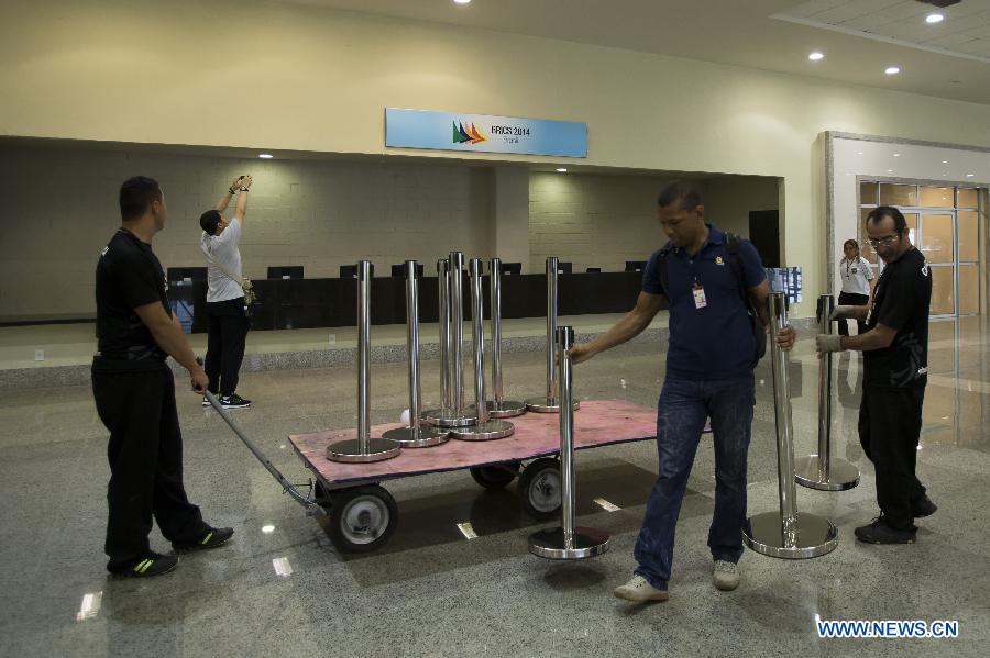 Staff members work at the lobby of the Center for Events of Estado Ceara in Fortaleza, Brazil, July 13, 2014. The sixth BRICS Summit will be held here on July 15, 2014. (Xinhua/Xu Zijian)