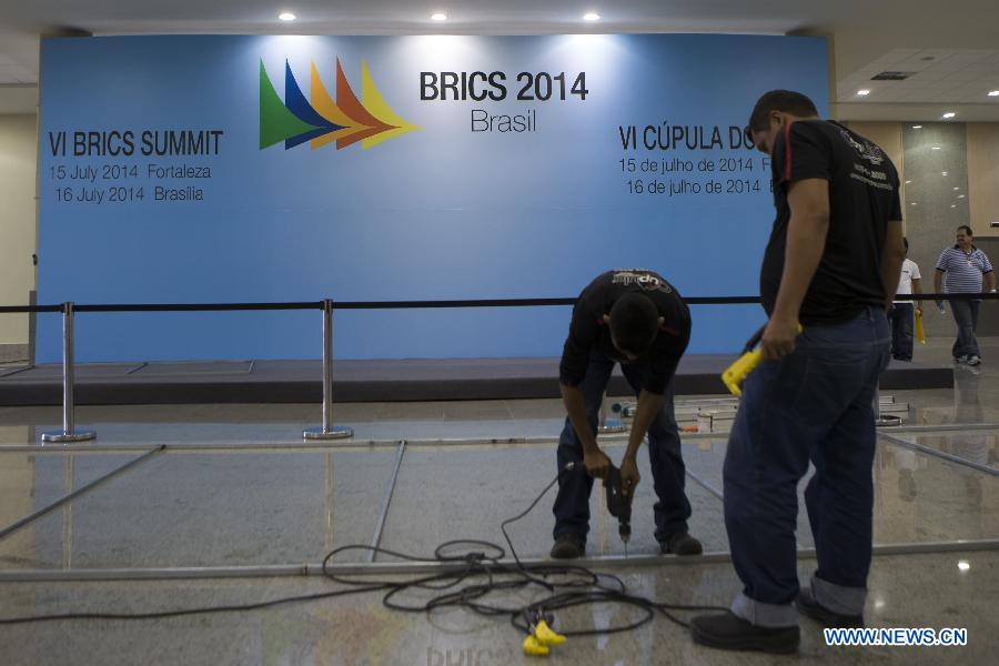 Staff members work at the lobby of the Center for Events of Estado Ceara in Fortaleza, Brazil, July 13, 2014. The sixth BRICS Summit will be held here on July 15, 2014. (Xinhua/Xu Zijian)